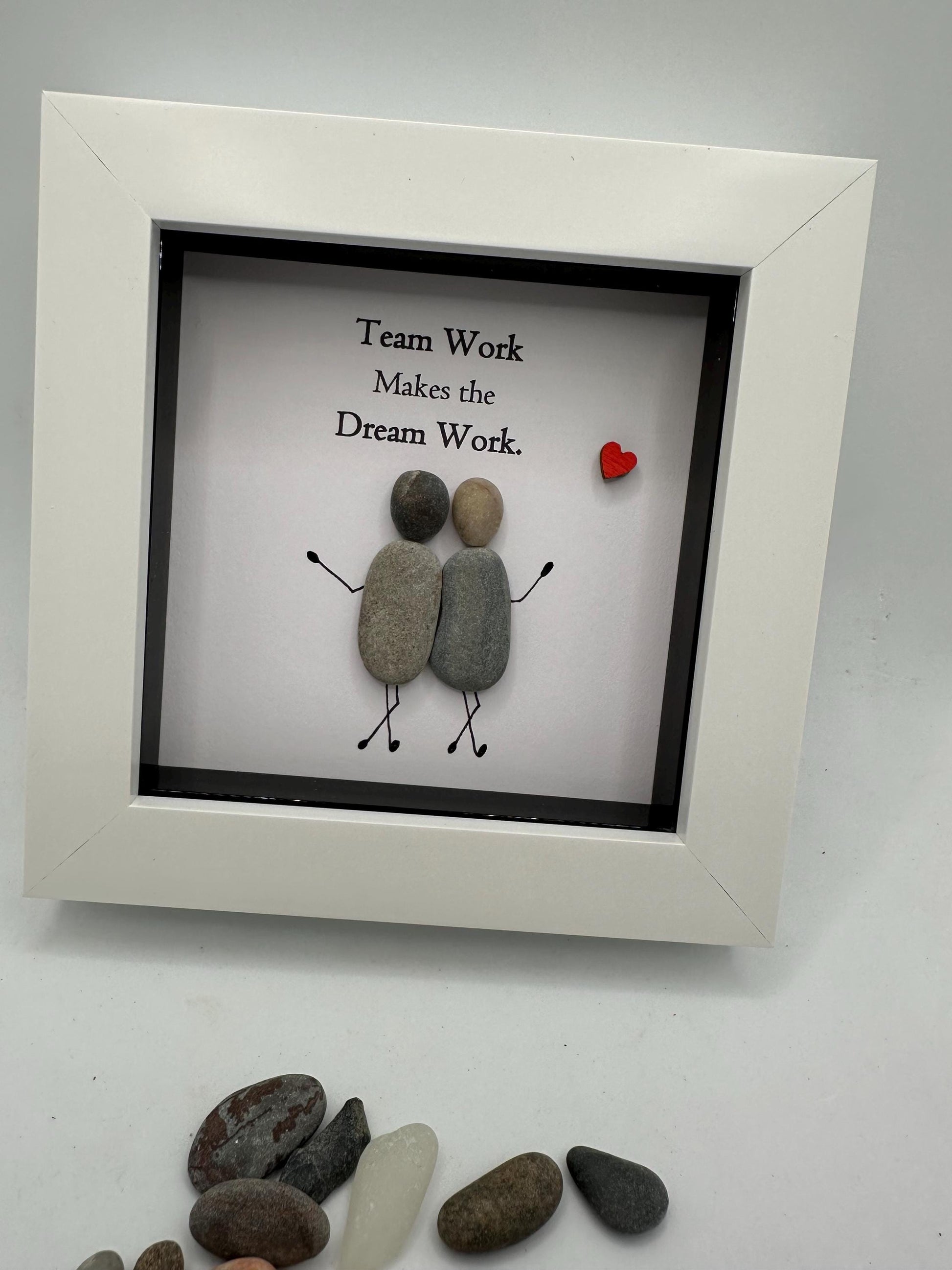 ** colleague pebble art, employee gift, team work gift, pebble art work Cute pebble art team work gift for any colleague. With quote “team work makes the dream work. These are 4”x4” available in white, grey and lightwood frames. All come individual boxed making them ideal gifts. frame information: 4”x4” frames are varied depending on availability all can be hung on the wall and some not all may come with a strut for table standing.