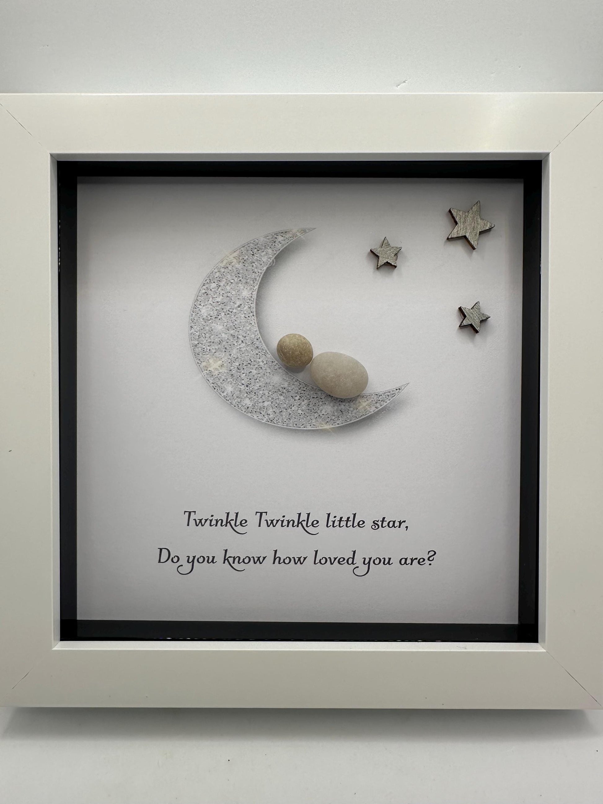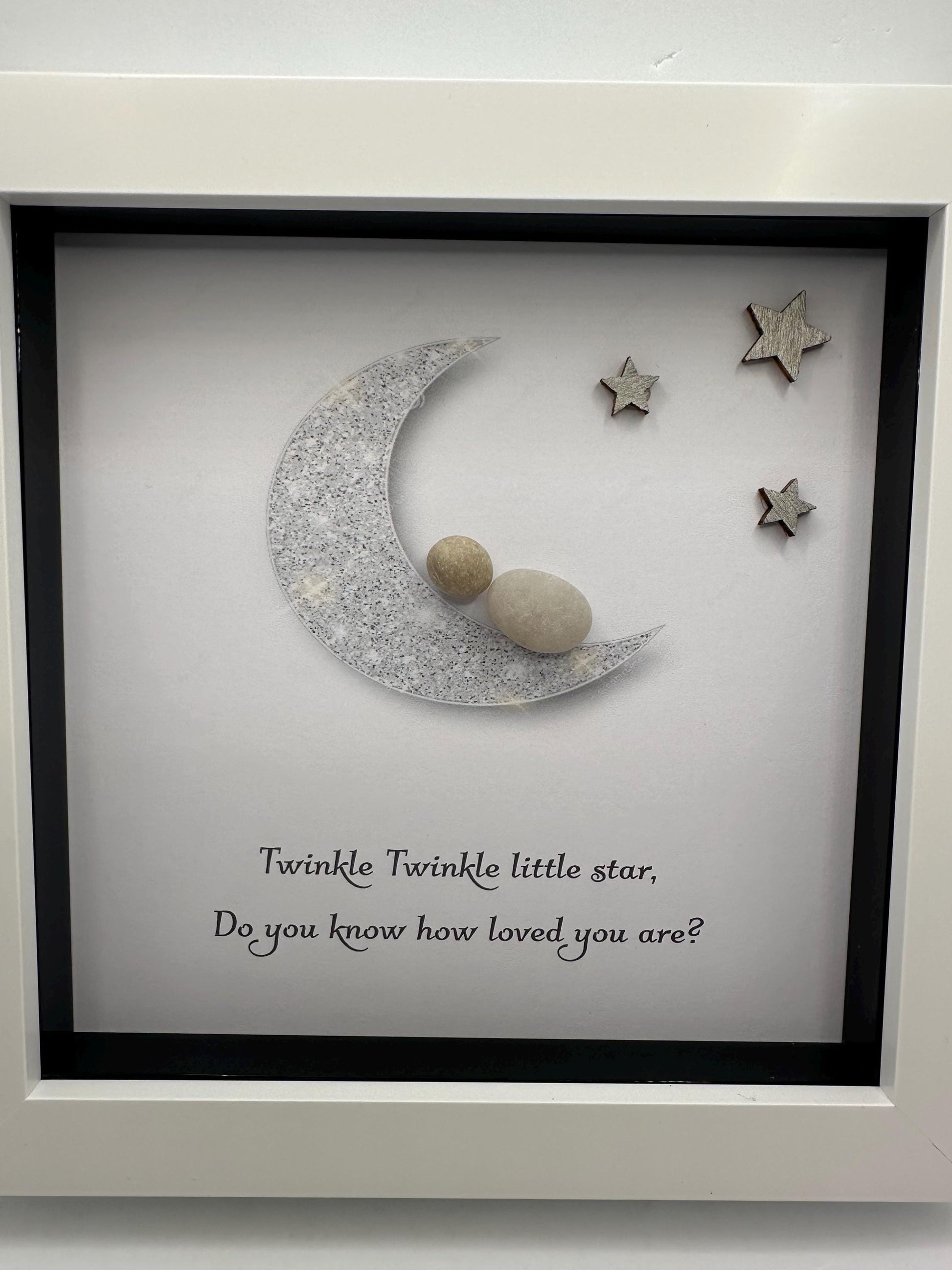 ** Cute pebble art new baby frame Featuring a moon with a pebble baby with the quote “ Twinkle, Twinkle little star do you know how loved you are?” Picture for illustration only you will receive the same design however pebble colour/size & texture may vary as no 2 pebbles are the same. Made on a 6”x6” high quality acrylic frame That can be wall hung or stood on a table using the back strut. Frames come individually boxed making them ideal for gifting. Any questions please ask.